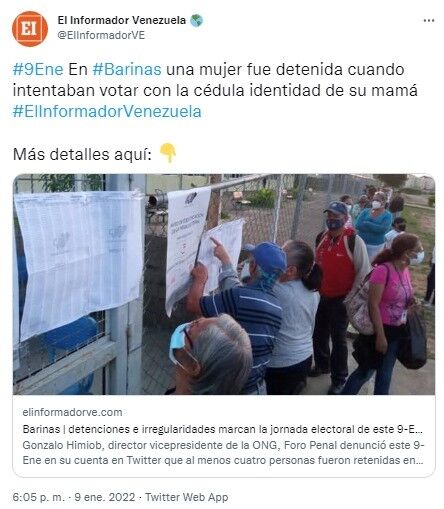 Guachimán Ciudadano en su monitoreo del tema electoral en las redes, en ocasión de la elección en Barinas este domingo 9 de enero, hasta las 7:00 p.m. detectó en la red social Twitter 520 mensajes distintos con contenido referente a denuncias de posibles irregularidades en el proceso de votación, destacando las denuncias de: movilización de electores (147), irregularidades sobre voto… Leer más »Elección en Barinas y denuncias en Twitter